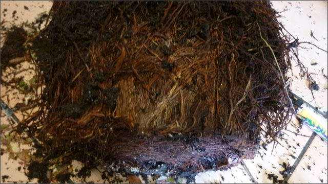 這是二年拆下盆的結構,可以看出根全部繞著盆走,中心幾乎沒根系,因此盆土應重視周圍的養份,中間可以不必管它