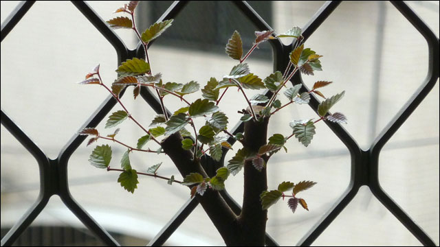 換盆一個月後,長出紅綠色毛絨絨的葉片,櫸木剛長出的葉片最可愛。