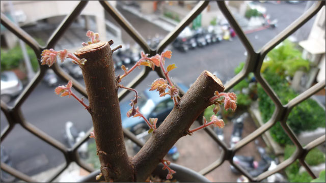 @14盆櫸木中的第一盆,一月後長出滿滿的芽,我剪除了幹部的芽。